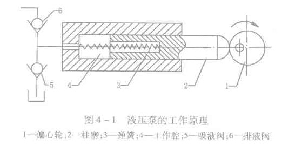 液壓泵的類型雖然不同,但它們的工作原理卻是相同的?,F以單柱塞泵為例說明液壓泵的基本工作原理。如下圖所示,偏心輪1旋轉時,柱塞2在偏心輪和彈簧3的作用下在缸體內左右移動。柱塞2右移時,缸體中的密封工作腔4容積變大,產生真空,郵箱中的油液在大氣壓力的推動下打開吸液閥5進入工作腔4;柱塞左移時,缸孔中的工作腔變小,油液被強迫通過排液閥6進入系統中。當偏心輪連續(xù)旋轉時,便周而復始地重復上述過程。