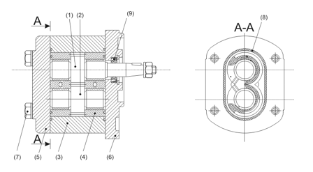 由Hidraulica UM Plopeni生產(chǎn)的齒輪電機(jī)幾乎與齒輪泵相同,主要由一對齒輪組成,(1)和(2),它們在由軸承襯套(4)支撐的殼體(3)。蓋子(5)和法蘭(6)通過螺釘(7)與主體連接在一起。密封環(huán)(8)和旋轉(zhuǎn)箍(9)提供結(jié)構(gòu)的密封。