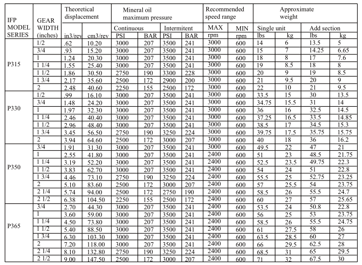 P315,P330,P350,P365齒輪泵技術(shù)參數(shù):