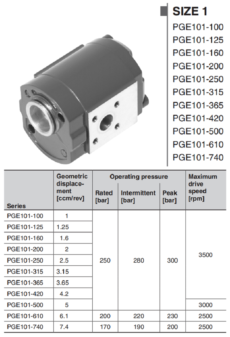 PGE101 是我們用于開環(huán)液壓系統(tǒng)的外嚙合齒輪泵的 1 號(hào)型號(hào)。