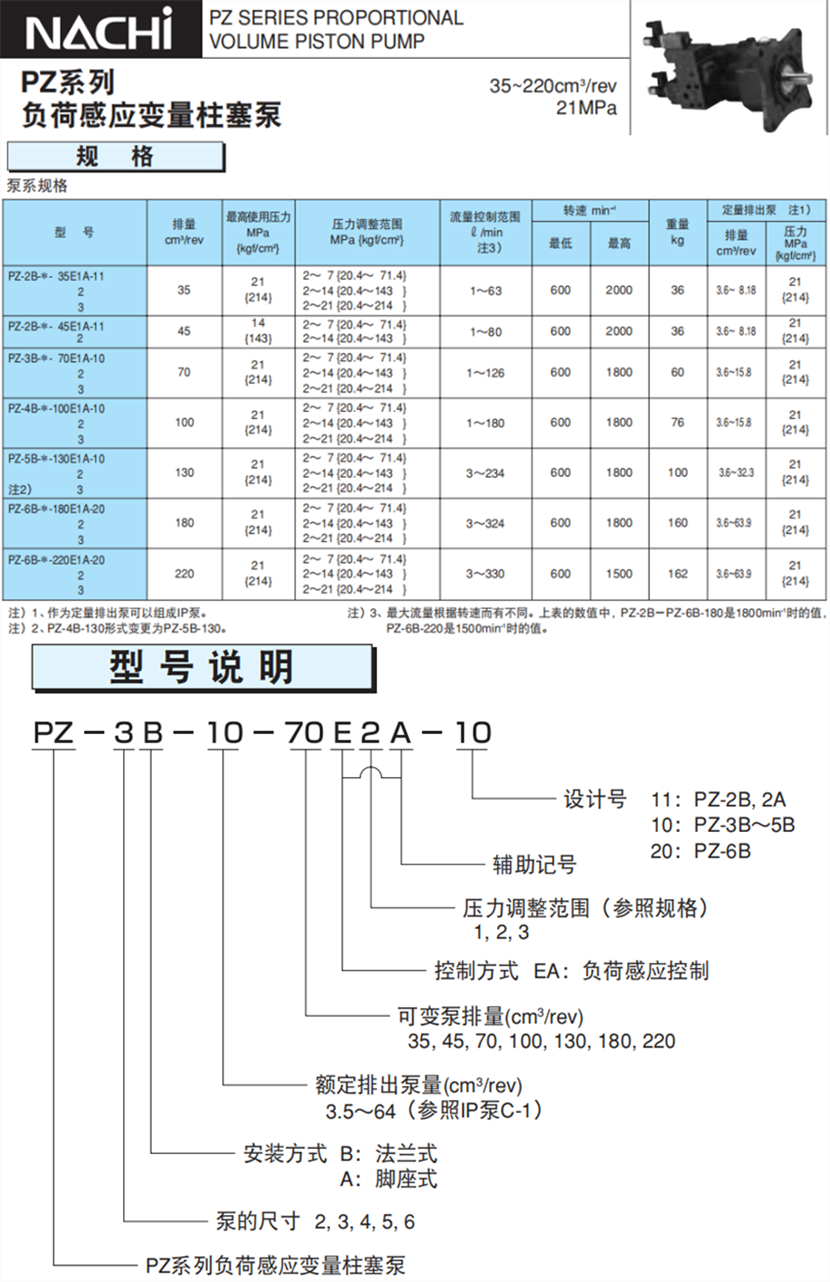 不二越PZ系列負(fù)荷感應(yīng)變量柱塞泵規(guī)格及型號說明: