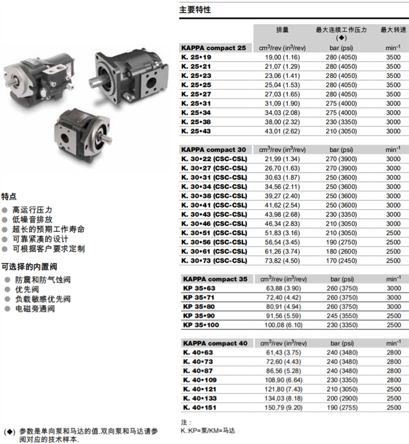 排量范圍: 從 19,00 cm3/rev (1.16in3/rev) 到150,79 cm3/rev (9.20 in3/rev),分25,30,35和40規(guī)格。