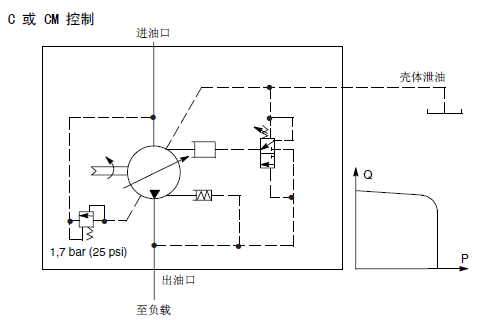 彈簧腔(控制)壓力與出口壓力之間隔著一個內(nèi)部節(jié)流孔。當(dāng)節(jié)流孔壓降達到壓差設(shè)定值時出口壓力使閥芯移動,泵排量減小。